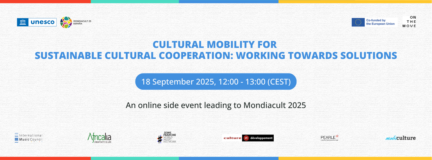 A free registration webinar on "Cultural mobility for sustainable cultural cooperation: working towards solutions". It is a side event in the lead-up to MONDIACULT 2025, taking place 18 September 2025: